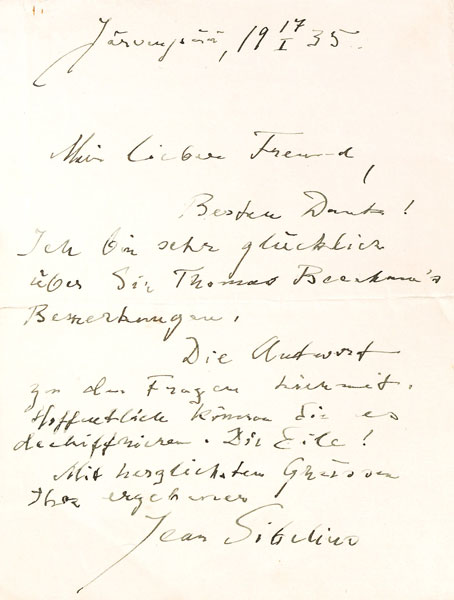 Letter from Sibelius to the record producer Walter Legge, 1935